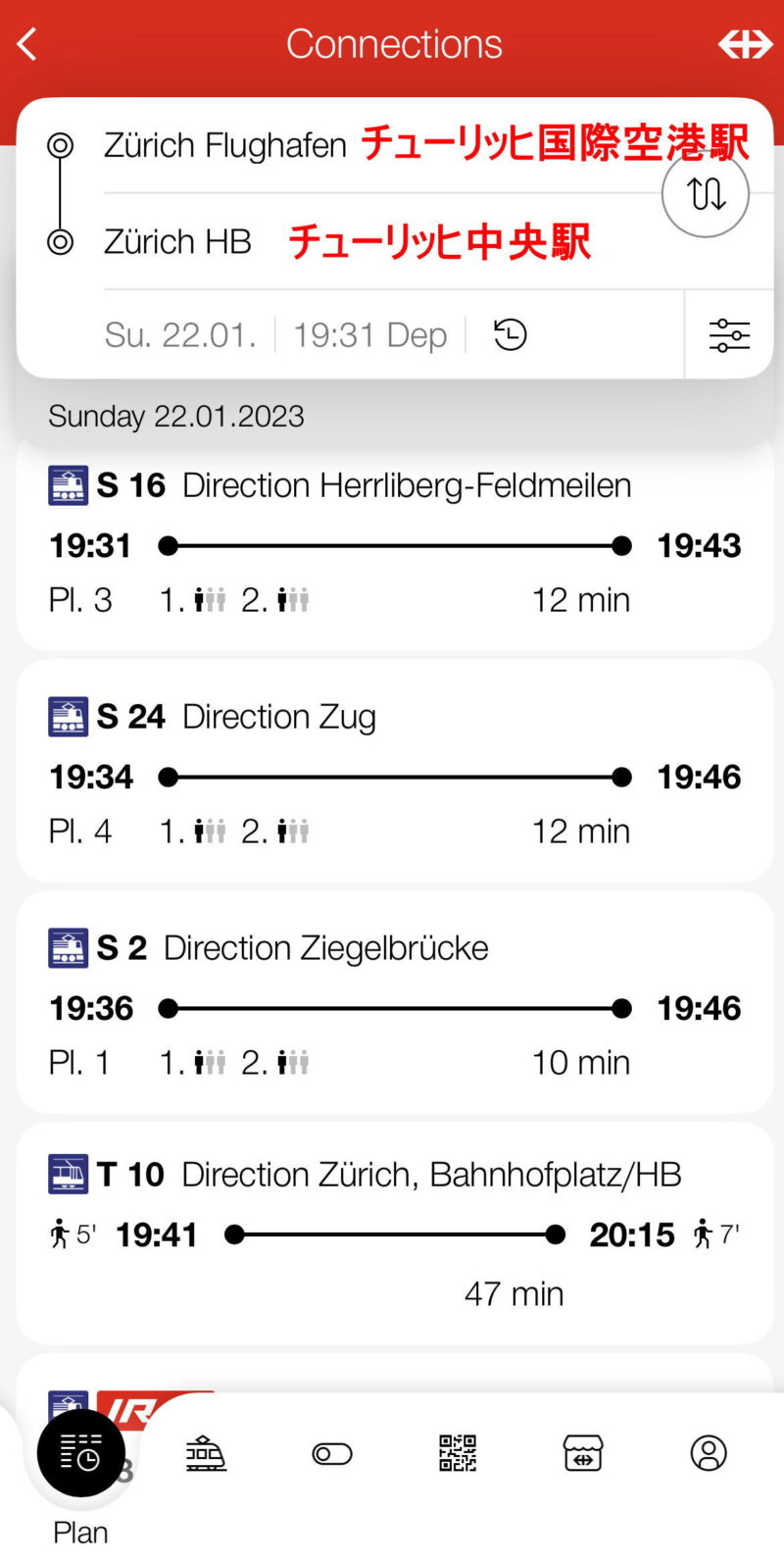 チューリッヒ国際空港到着時刻は同日18:30前後になるので