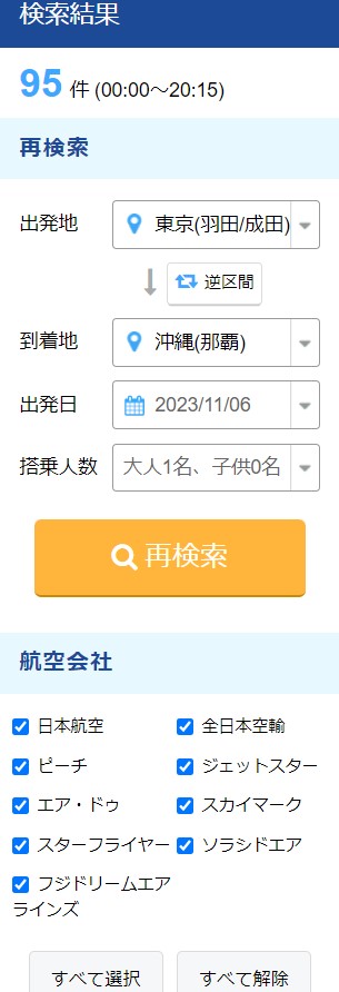 もし航空会社を選択して表示した場合や、日程など検索条件を変更したい場合は、