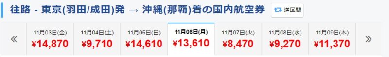 *今回は例として往復、東京(羽田/成田)→沖縄(那覇)、大人一名をで検索してみます。