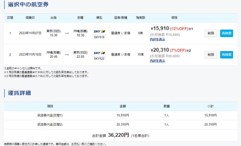 するとこのように選択した往復便の内容と