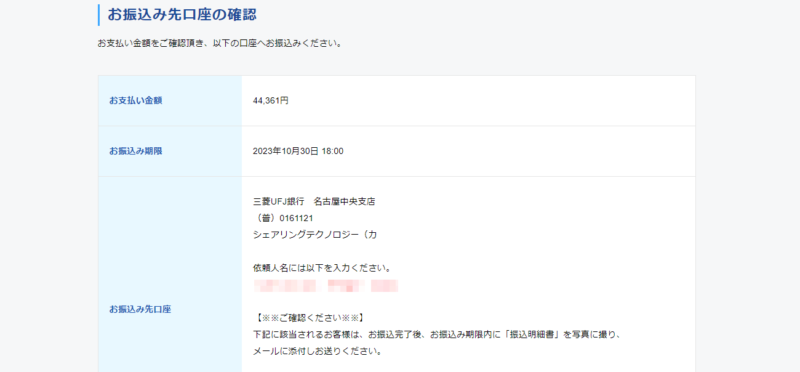 すると、ここで振込先の銀行口座情報が表示されます。