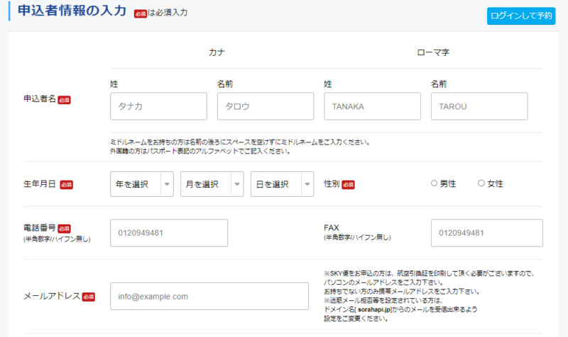 ・ご搭乗様のお名前、電話番号、メールアドレス