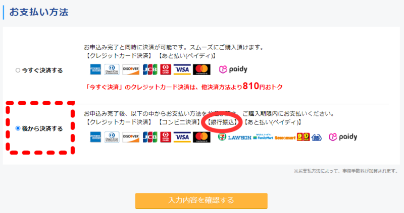「後から決済する」を選択し、入力確認画面に進みましょう。